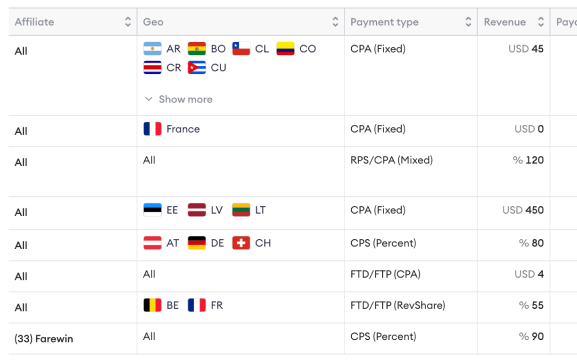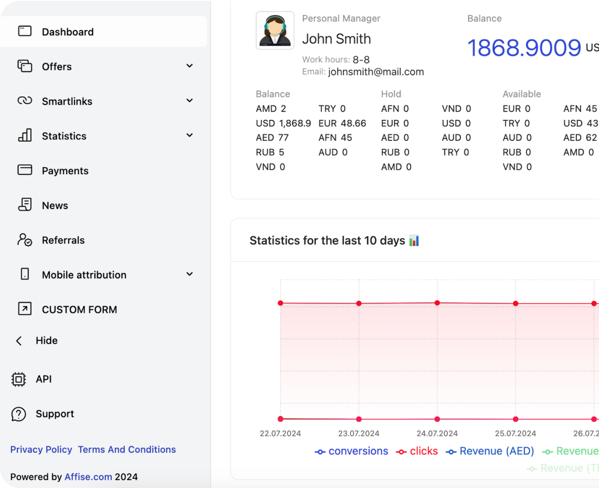 Um tamanho único não serve para todos. É por isso que o Affise oferece diferentes opções de pagamento que você pode adaptar para atender às necessidades específicas de seu produto. Seja CPA, CPL ou RevShare, você decide como recompensar seus afiliados.