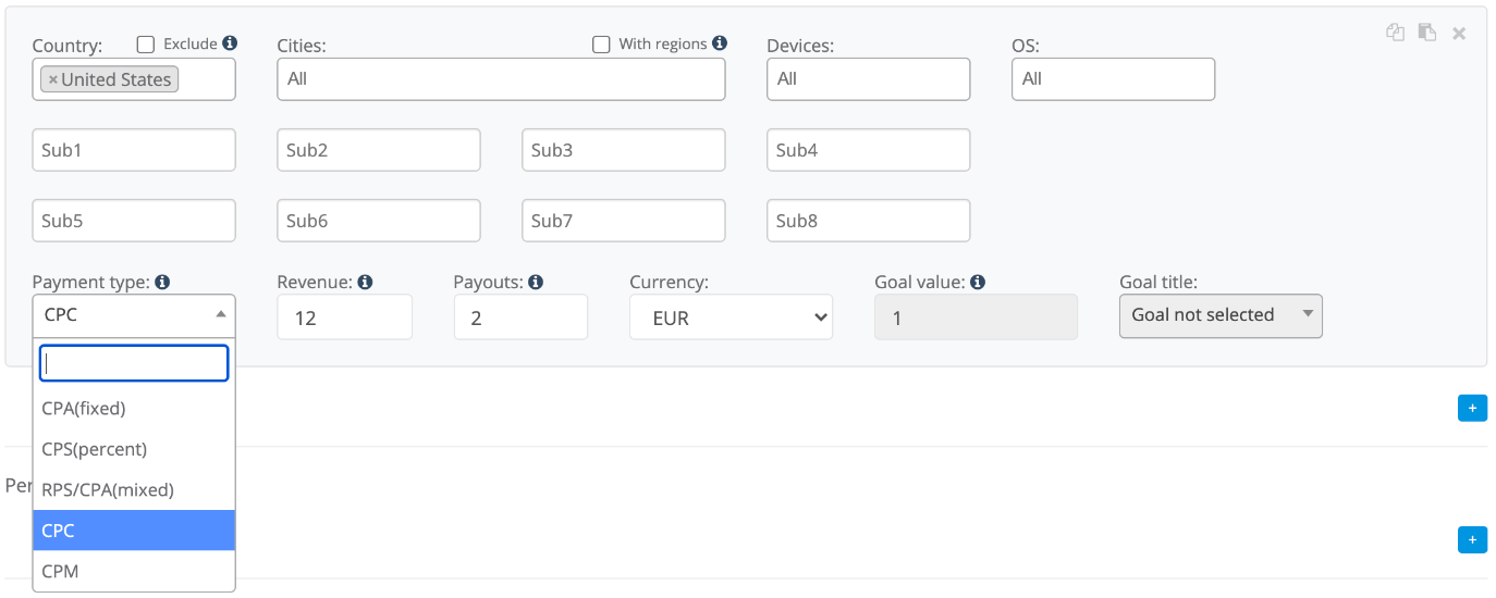 The setup is very easy and does not require you to learn how to use a new tool. For your convenience, we have improved the existing Payouts section in the offer with one subtle feature. Namely, CPC and CPM can be selected in the ‘Payment type’ field: