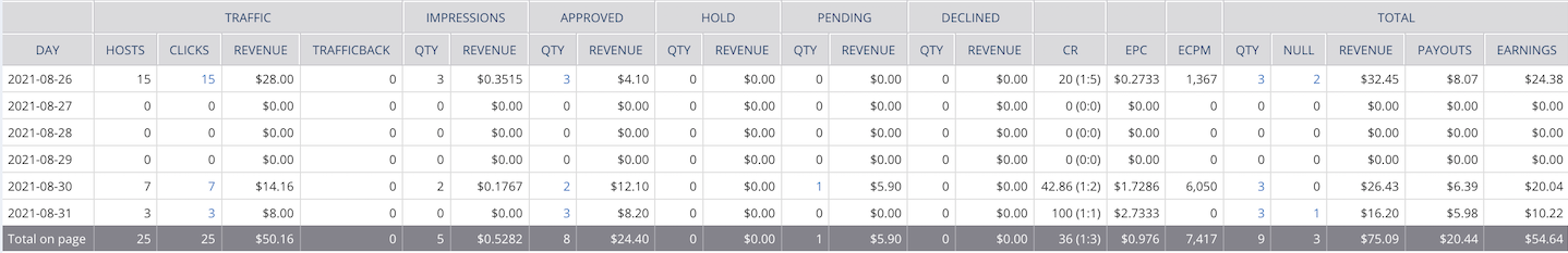 After activating the CPC and CPM option, you will see new columns in the table: revenue for clicks and revenue for impressions. The ‘Total’ section will include the money for all metrics (clicks, impressions, conversions).