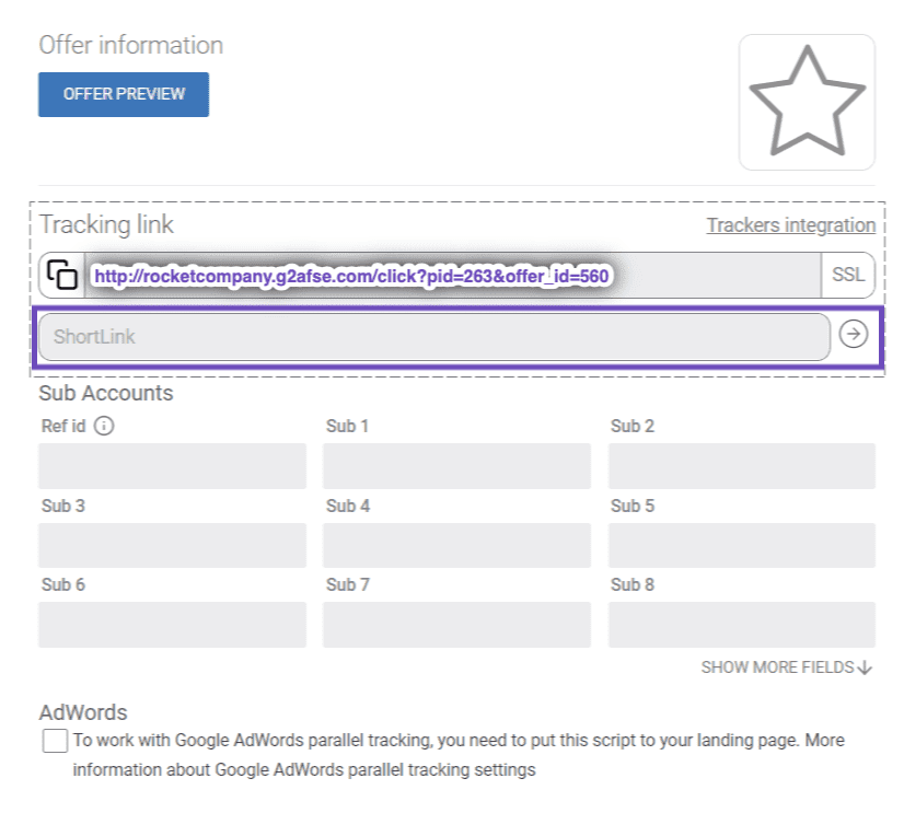 To access the ShortLink feature, go to the Webmaster panel → Offer’s preview page → Tracking link field. There you’ll find the “Short link” button.